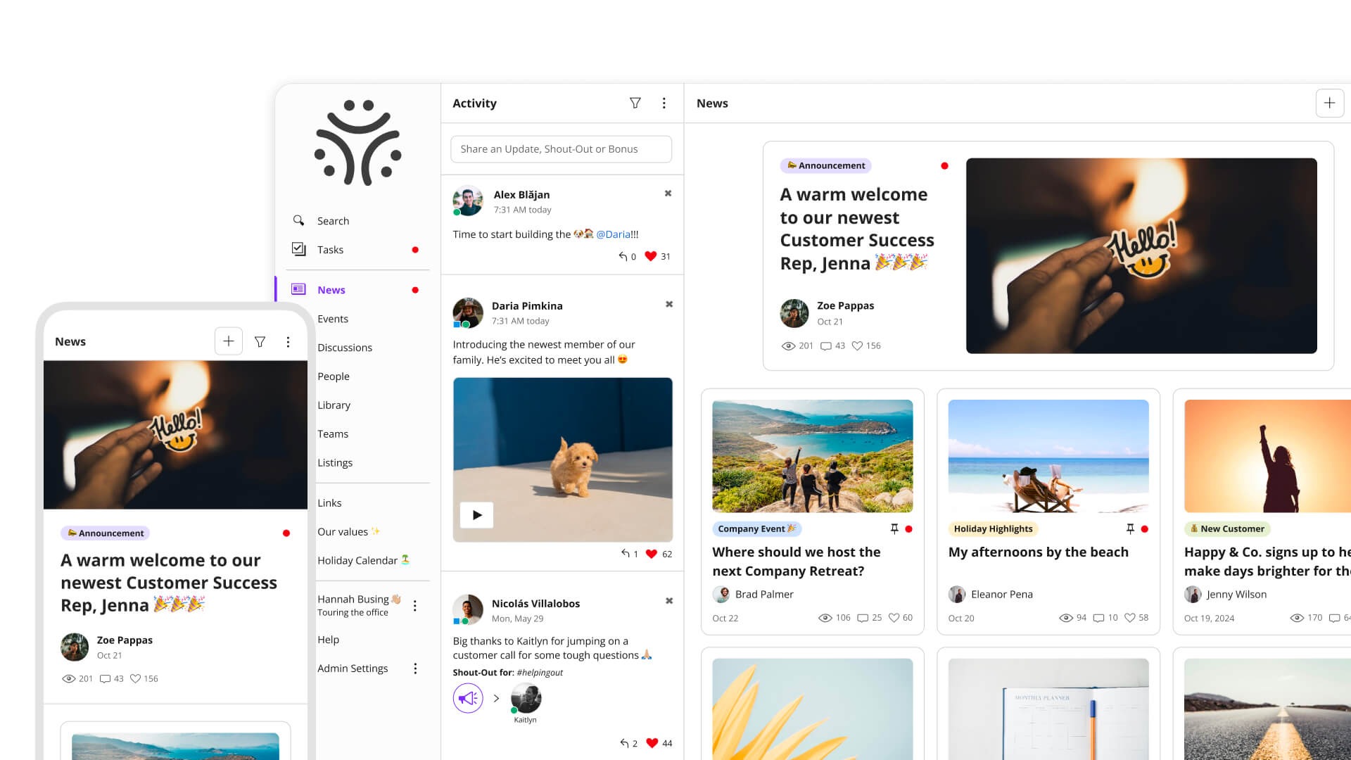 Alongside formal updates, the Activity stream supports everyday connection and visibility. Teams share quick posts, recognize peers with Shout-Outs, and highlight milestones like birthdays or work anniversaries, keeping culture present without overwhelming the feed. Because these moments live next to official communications rather than replacing them, the platform tends to feel active without becoming noisy.