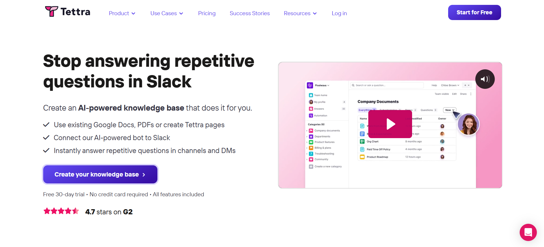 Tettra is a lightweight internal knowledge base built for small to mid-sized teams that want to stop answering the same questions repeatedly. Its primary differentiator is how tightly it's woven into Slack; employees ask questions directly in their chat window, and Tettra's AI bot Kai searches the knowledge base and returns an answer without anyone leaving the conversation. If Kai can't find one, it routes the question to the right subject matter expert and saves the response for next time.