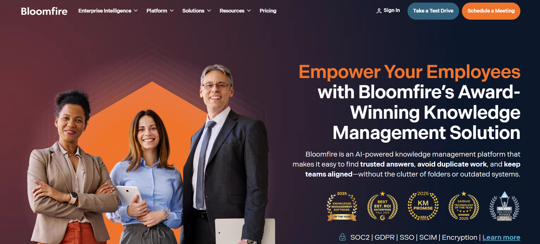 Bloomfire is an enterprise knowledge management platform built for organizations where critical knowledge lives across more than just docs. It deep-indexes PDFs, slide decks, video recordings, and audio, so employees can search for a specific phrase and find it inside a transcript or buried in a deck, not just in a title or tag. The result is a searchable source of truth even when people don’t know where information lives or what it’s called.