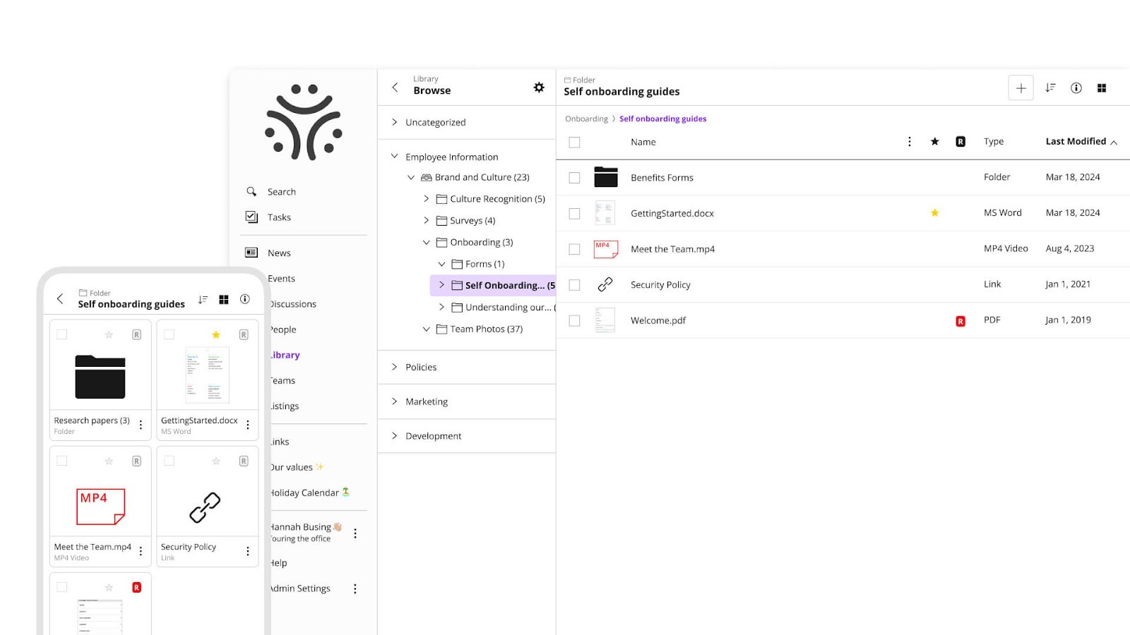 Happeo is a browser-based intranet and knowledge platform with native iOS and Android apps, designed primarily for organizations running on Google Workspace. It provides a centralized digital home for internal content and updates, without relying on a traditional document-library-first intranet model. Teams use Happeo to organize policies, SOPs, onboarding materials, and recurring communications in a way that’s easier to keep current and easier for employees to navigate, particularly in Slack- and Google-centric environments.
